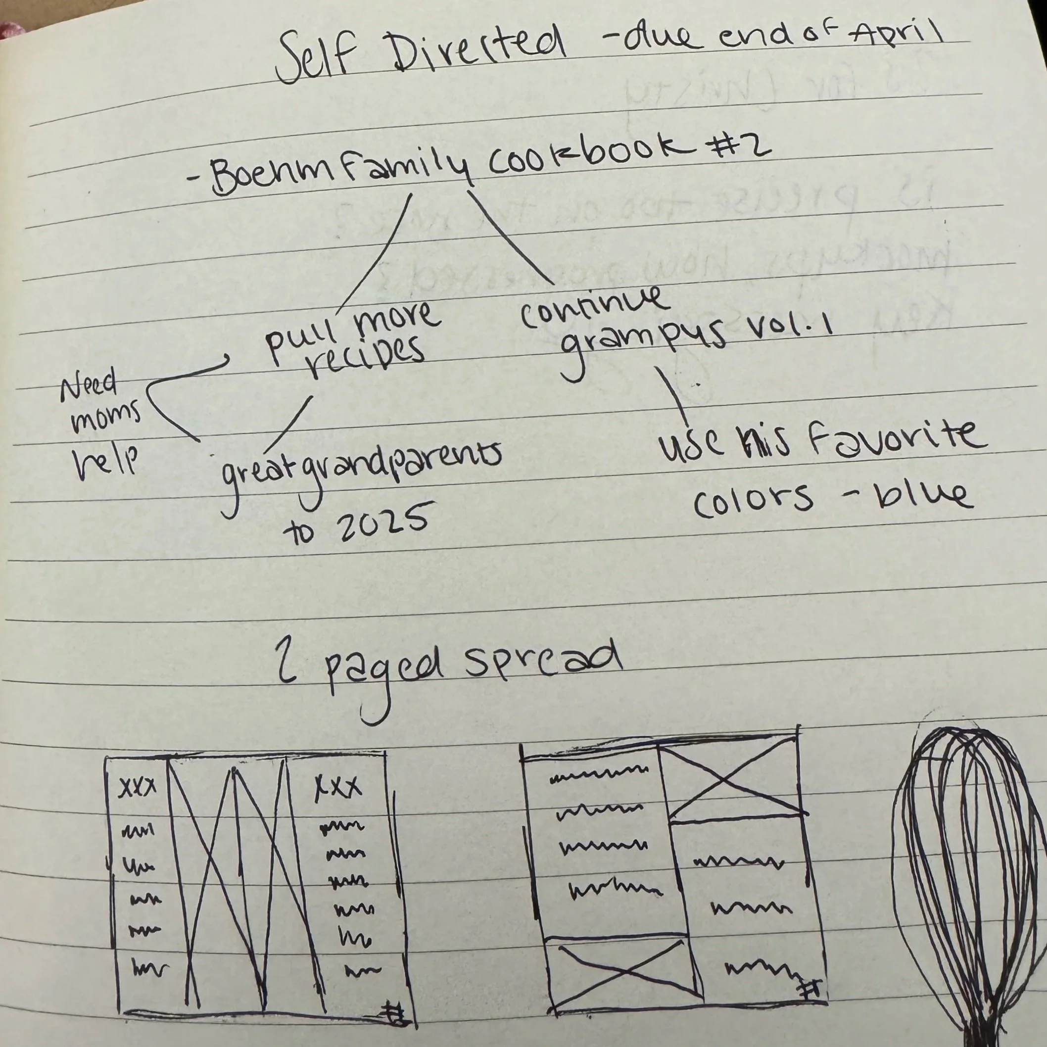 This project continues the cookbook my grandfather began years ago, adding more family recipes and giving them a structured, thoughtfully designed layout. Rather than keeping our recipes in scattered notes and old pages, I set out to create a structured and dependable layout that brought everything into one place.