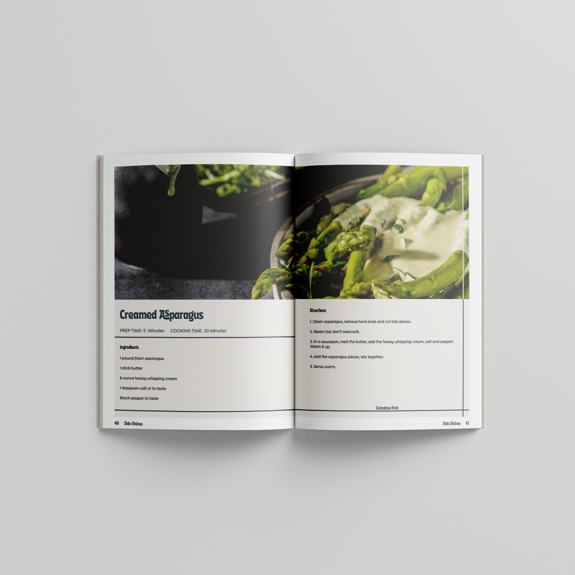 I built the book around clear grid work, consistent typography, and a layout that makes each recipe easy to read while still feeling connected to the larger collection. The result is a functional, archival piece that preserves our family’s cooking traditions and carries my grandfather’s project forward for the next generation.